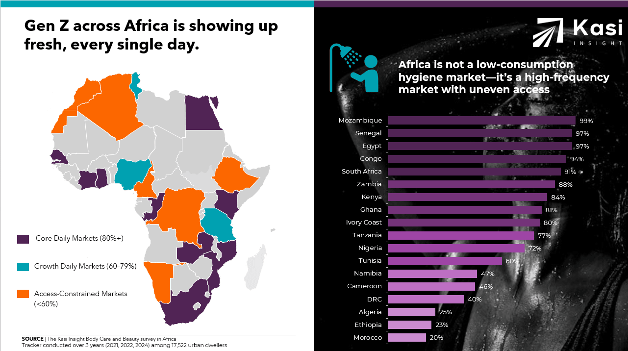 Across Africa, daily showering among Gen Zs is more common than not, but the story varies dramatically by country. From Senegal and Egypt, where nearly everyone showers every day, to Morocco and Ethiopia, where daily bathing is far less frequent, the patterns reveal surprising regional and cultural contrasts. Facilities are largely available, but some countries still face notable access gaps. Curious which nations lead, which lag, and what these differences tell us about hygiene habits across the continent?