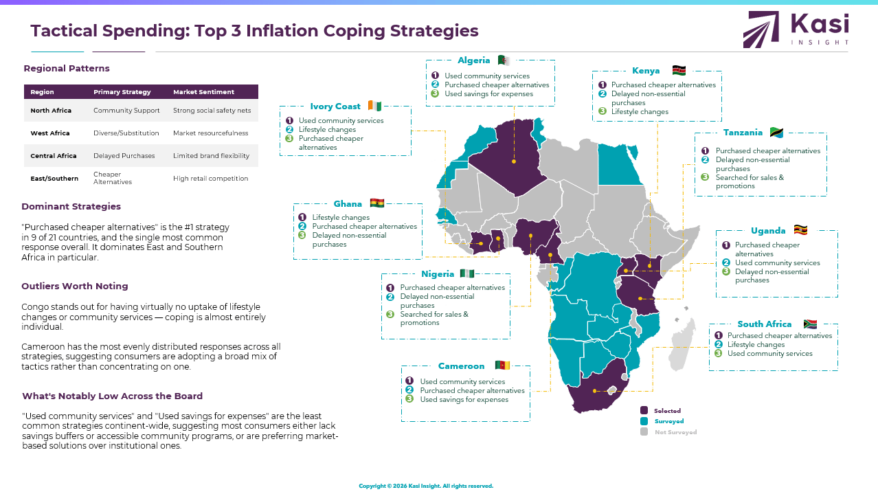 Across Africa, rising inflation is reshaping how consumers manage their wallets, and the patterns are revealing. Our latest Kasi Map shows that substitution, purchasing cheaper alternatives, is now the dominant coping strategy, especially in East and Southern Africa, while reliance on savings or community support remains minimal. Regional differences are striking: Ghana’s consumers favor repair and reuse, Congo’s households act largely alone, and North Africans lean on lifestyle adjustments. For brands and policymakers, understanding these local “coping playbooks” is becoming critical to staying relevant in 2026.