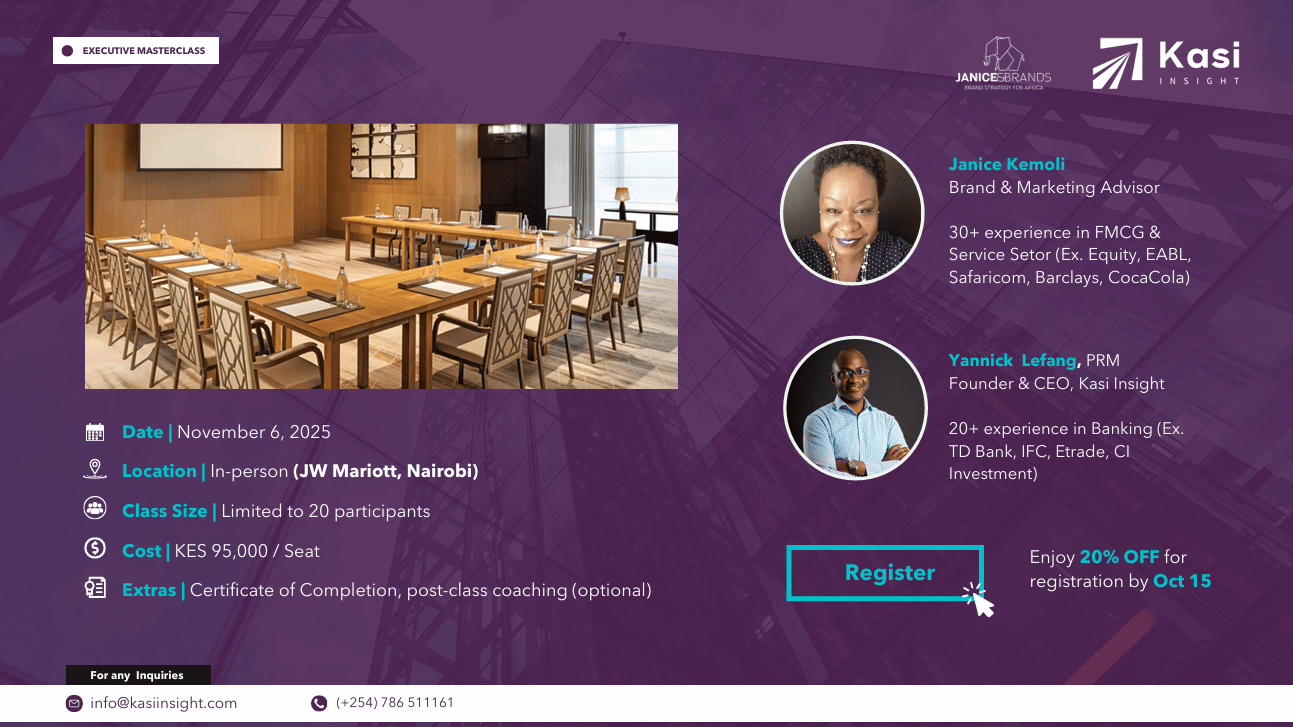 Join industry leaders Janice Kemoli (Brand & Marketing Advisor) and Yannick Lefang (Founder & CEO, Kasi Insight) for an exclusive in-person session at JW Marriott, Nairobi on November 6, 2025.